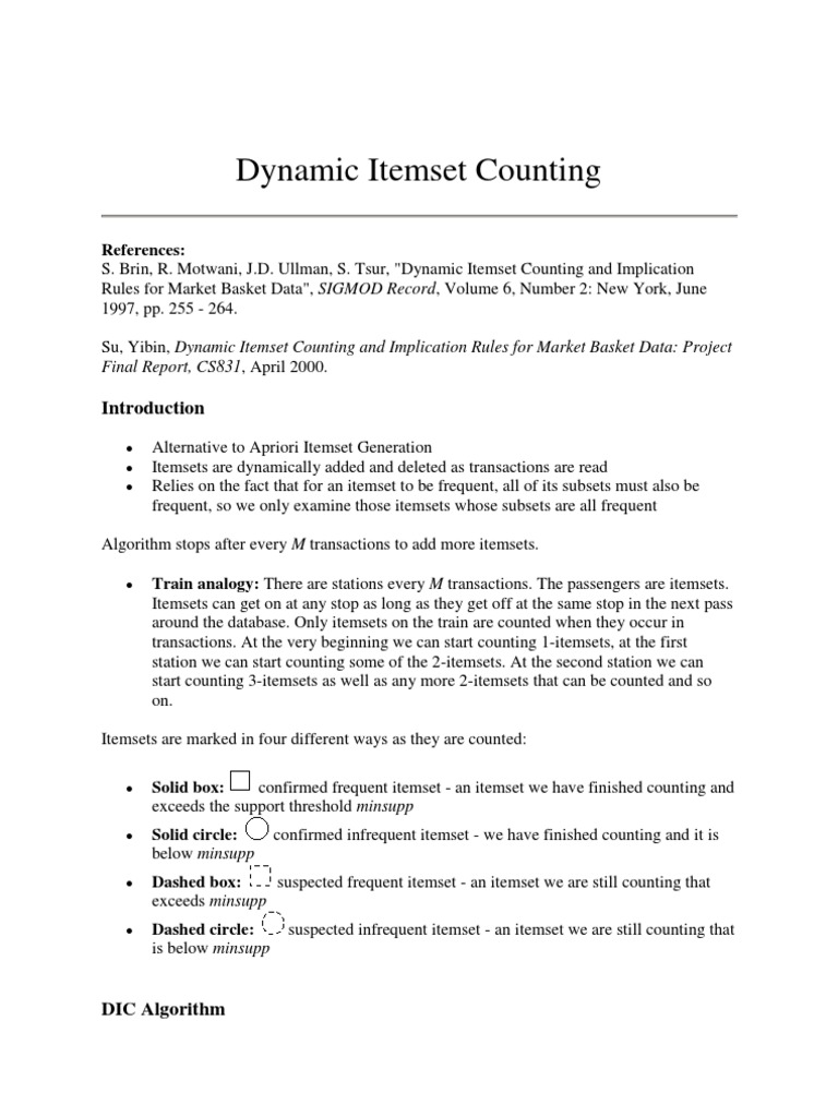 References: S. Brin, R. Motwani, J.D. Ullman, S. Tsur, "Dynamic Itemset Counting and Implication Rules for Market Basket Data", SIGMOD Record, Volume 6, Number 2: New York, June 1997, pp. 255 - 264. Su, Yibin, Dynamic Itemset Counting and Implication Rules for Market Basket Data: Project Final Report, CS831, April 2000.