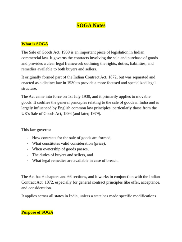 The purpose of the Sale of Goods Act, 1930 (SOGA) is to provide a clear and