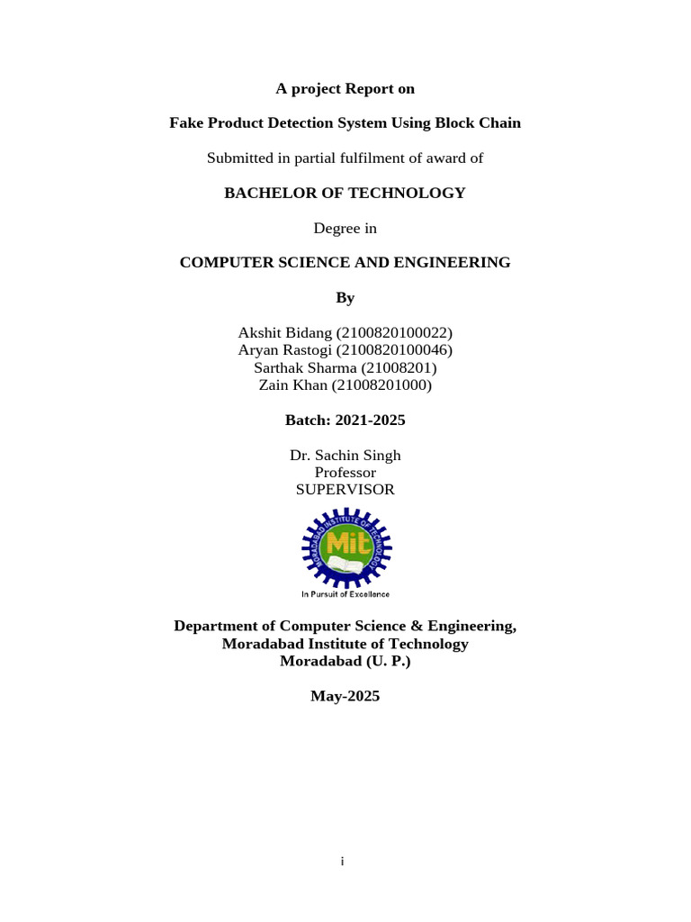 Certify that the Project report entitled “Fake Product Detection Using Block Chain”, done