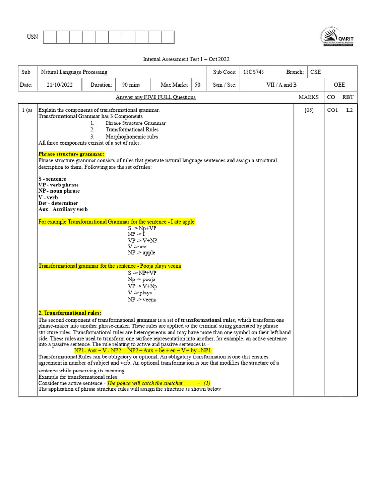 Sub: Natural Language Processing Sub Code: 18CS743 Branch: CSE