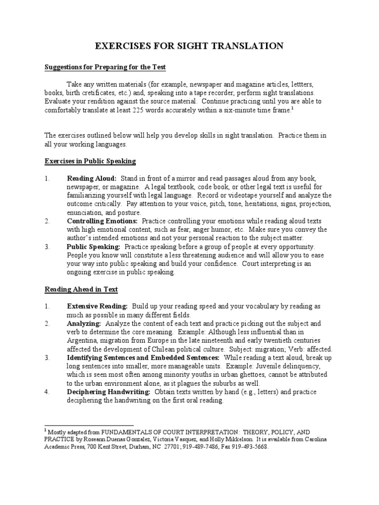 Suggestions for Preparing for the Test Take any written materials (for example, newspaper and magazine articles, lettters, books, birth cretificates, etc.) and, speaking into a tape recorder, perform sight translations. Evaluate your rendition against the source material. Continue practicing until you are able to comfortably translate at least 225 words accurately within a six-minute time frame.1 The exercises outlined below will help you develop skills in sight translation. Practice them in all your working languages. Exercises in Public Speaking 1. Reading Aloud: Stand in front of a mirror and read passages aloud from any book, newspaper, or magazine. A legal textbook, code book, or other legal text is useful for familiarizing yourself with legal language. Record or videotape yourself and analyze the outcome critically. Pay attention to your voice, pitch, tone, hesitations, signs, projection, enunciation, and posture. Controlling Emotions: Practice controlling your emotions while reading aloud texts with high emotional content, such as fear, anger humor, etc. Make sure you convey the authors intended emotions and not your personal reaction to the subject matter. Public Speaking: Practice speaking before a group of people at every opportunity. People you know will constitute a less threatening audience and will allow you to ease your way into public speaking and build your confidence. Court interpreting is an ongoing exercise in public speaking.