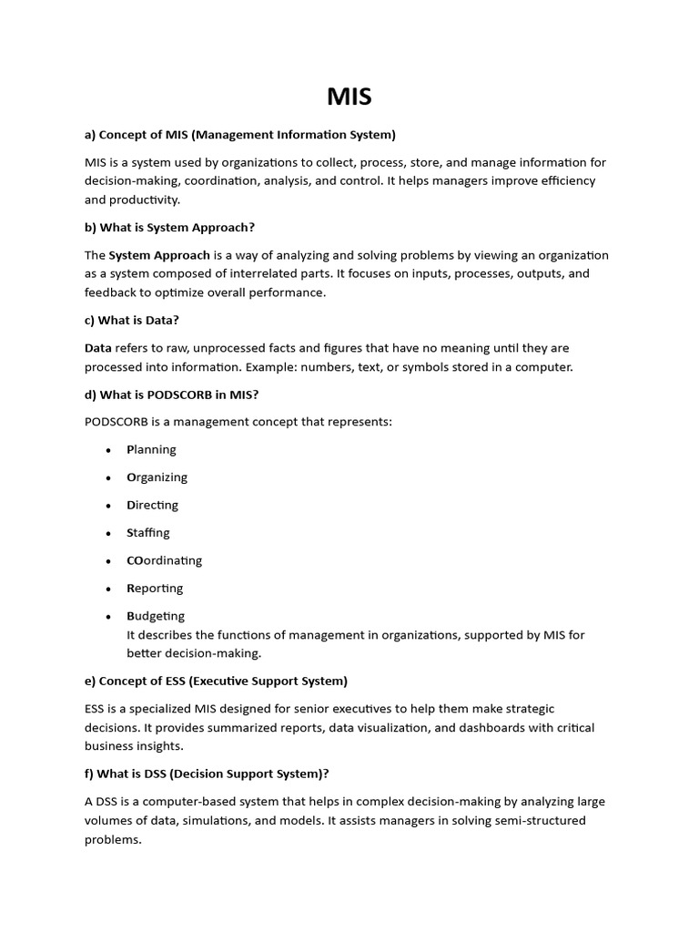 a) Concept of MIS (Management Information System)