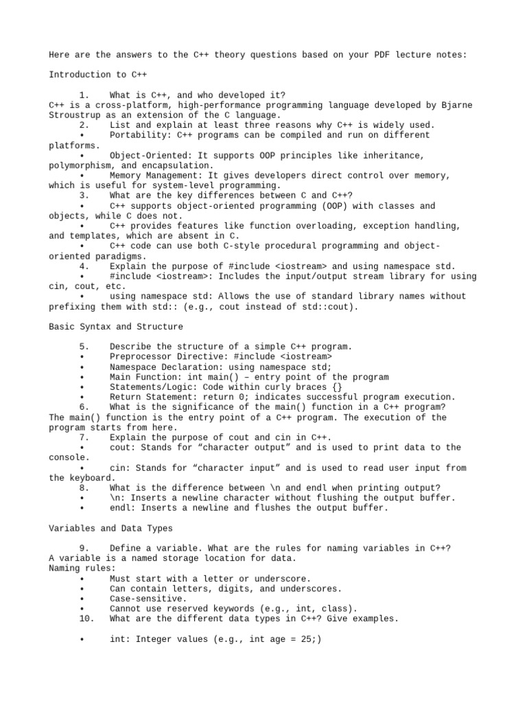 Here are the answers to the C++ theory questions based on your PDF lecture notes: