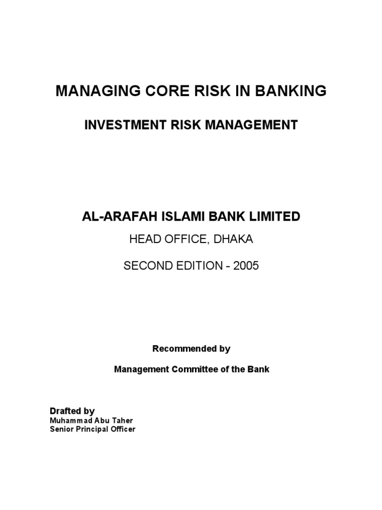 October 2003), Al-Arafah Islami Bank Limited has prepared risk profile in line with the guidelines and framework provided by Bangladesh Bank to customize in their existing framework to better manage the investment portfolio to suit the new changes. Accordingly, the committee comprising the senior executives draws up detailed investment risk management framework for the bank, which was approved by the Board of Directors of the bank in its 125th meeting held on 16 June 2005. The approved policy guidelines is still in the pre-implementation stage. By this time, an Inspection Team of Bangladesh Bank has conducted Special Inspection on the implementation of Investment Risk Management guidelines in 16 July 2005. The Inspection Report has been sent to the Managing Director of the Bank on 07 September 2005. In the report they identified major gaps of Investment Risk Management guidelines incorporated in the approved policy and that of the guidelines of Bangladesh. In conclusion of the report the Inspection Team recommendations for implementation which are quoted below: The bank is advised to identify its interest in different business sectors as well as indicate its appetite for growth of investment portfolio in the policy to let the functionaries know its interest in business and appetite for growth of investment. The bank is advised to incorporate all the type of investment facilities in the policy to let the functionaries know its priority to investment portfolio facilities. The bank is advised to incorporate limits of large investment for single borrower/group/syndication in the policy to let the functionaries know its policy of extending single /group limits. The bank is advised to include its preference of Specific Industry Sector Exposure Cp in the policy to aware its functionaries to avoid over concentration of its investment n any one-industry sector. The bank is advised to incorporate the discouraging business sectors in the policy to avoid probable risks. The bank is advised to incorporate the investment facility parameters in the policy to minimize probable risks. has put some
