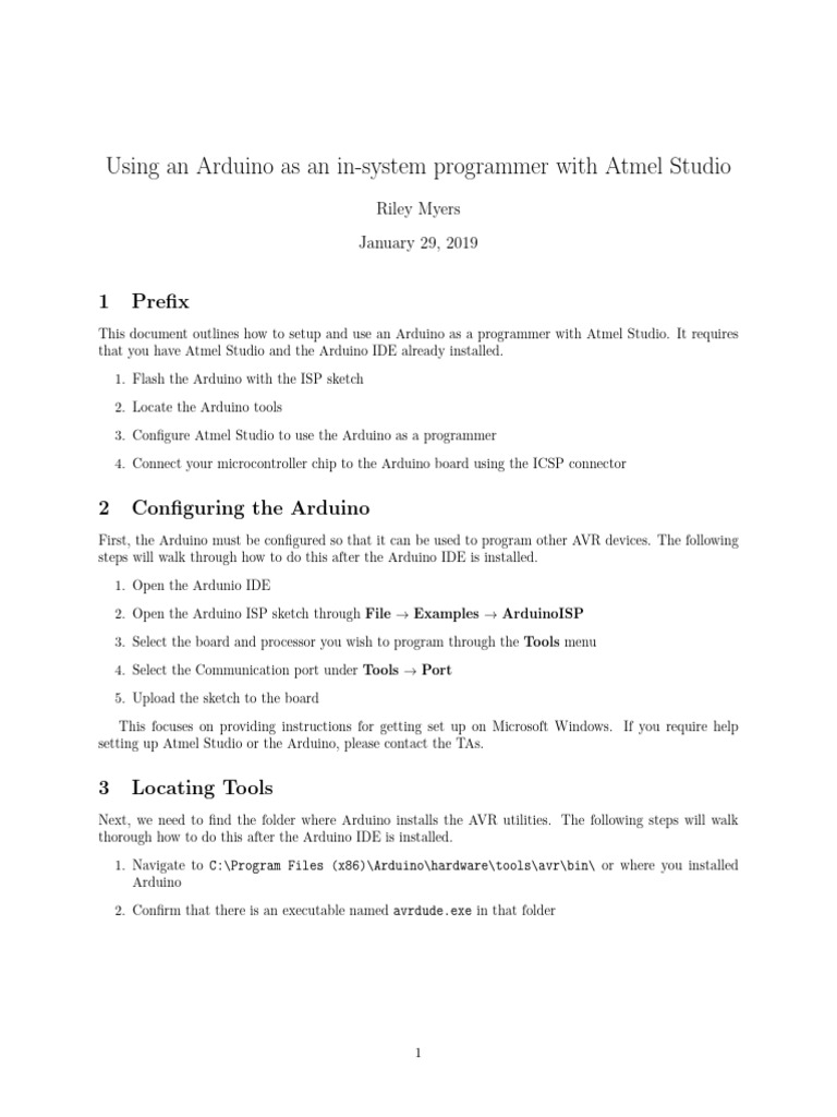 This document outlines how to setup and use an Arduino as a programmer with Atmel Studio. It requires