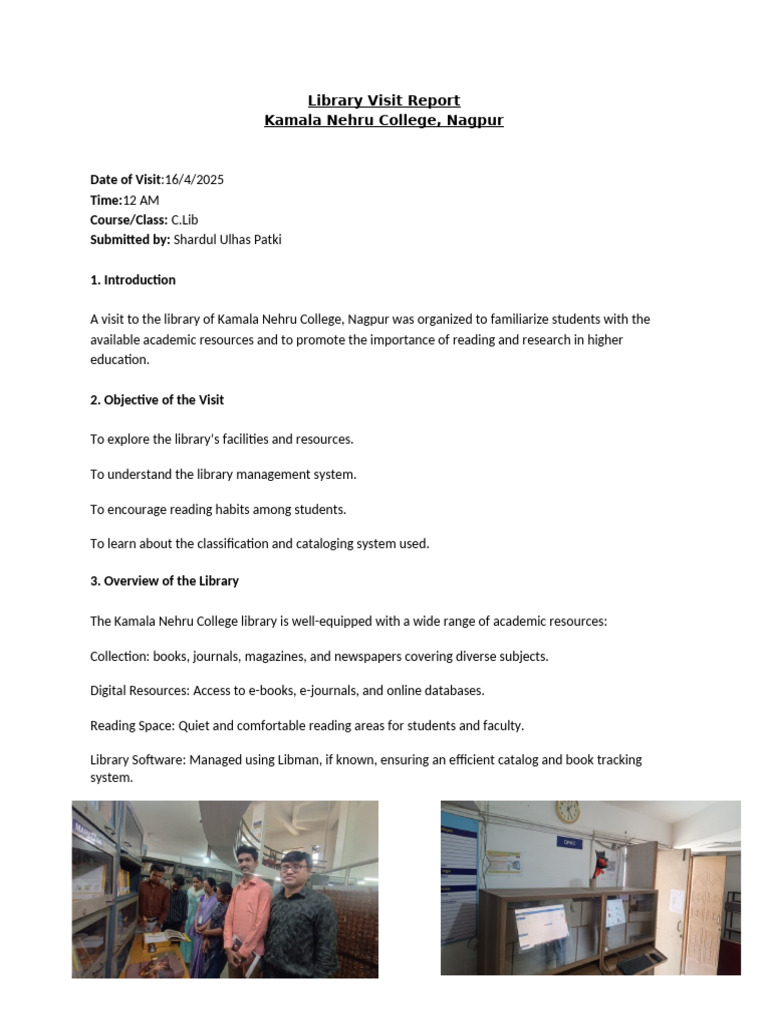 A visit to the library of Kamala Nehru College, Nagpur was organized to familiarize students with the