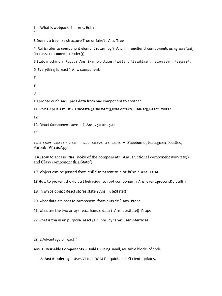 21. what are the two arrays react handle data ? Ans. useState(), Props