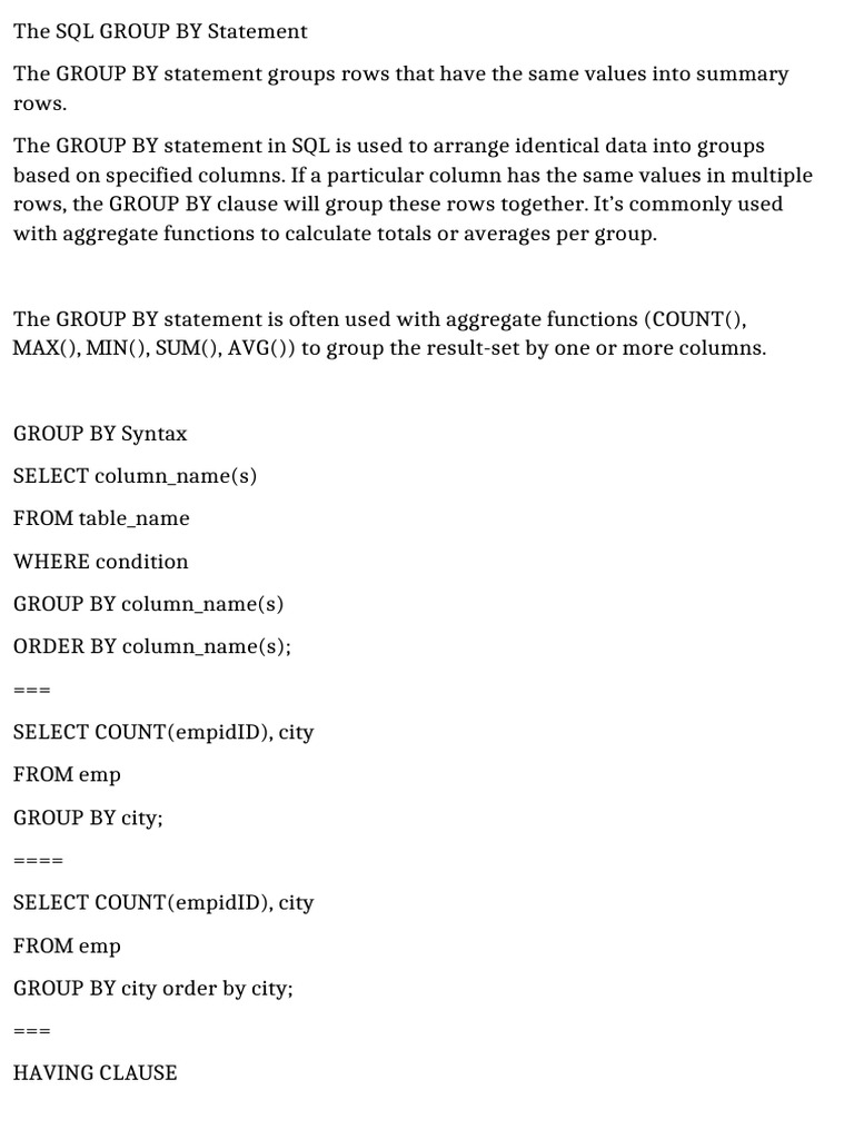 MAX(), MIN(), SUM(), AVG()) to group the result-set by one or more columns.