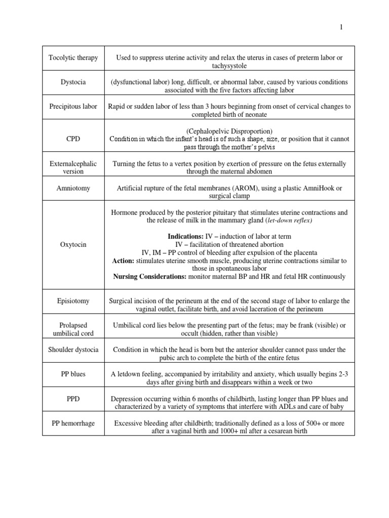 Used to suppress uterine activity and relax the uterus in cases of preterm labor or tachysystole (dysfunctional labor) long, difficult, or abnormal labor, caused by various conditions associated with the five factors affecting labor Rapid or sudden labor of less than 3 hours beginning from onset of cervical changes to completed birth of neonate (Cephalopelvic Disproportion) Condition in which the infants head is of such a shape, size, or position that it cannot pass through the mothers pelvis Turning the fetus to a vertex position by exertion of pressure on the fetus externally through the maternal abdomen Artificial rupture of the fetal membranes (AROM), using a plastic AmniHook or surgical clamp Hormone produced by the posterior pituitary that stimulates uterine contractions and the release of milk in the mammary gland (let-down reflex) Indications: IV induction of labor at term IV facilitation of threatened abortion IV, IM PP control of bleeding after expulsion of the placenta Action: stimulates uterine smooth muscle, producing uterine contractions similar to those in spontaneous labor Nursing Considerations: monitor maternal BP and HR and fetal HR continuously