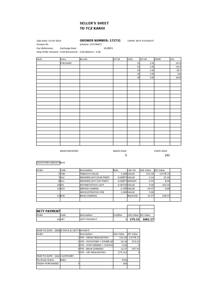 Sale Date: 21-05-2025 GROWER NUMBER: 172731 NAME: SENT INNOCENT