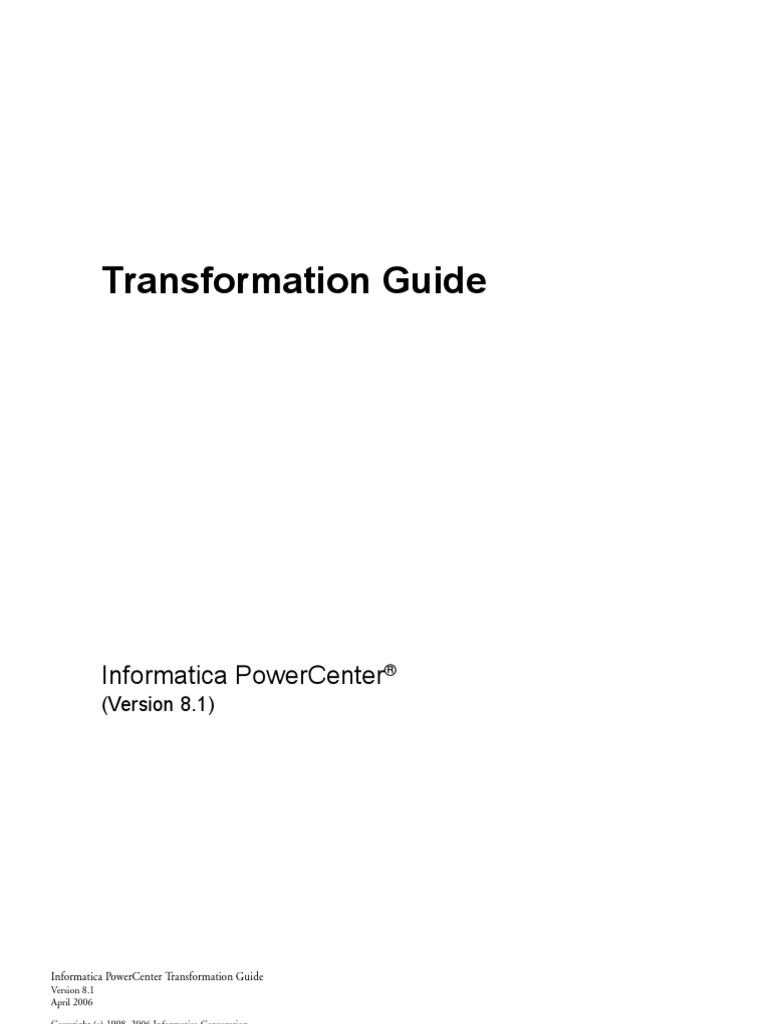 Figure Figure Figure Figure Figure Figure Figure Figure Figure Figure Figure Figure Figure Figure Figure Figure Figure Figure Figure Figure Figure Figure Figure Figure Figure Figure Figure Figure Figure Figure Figure Figure Figure Figure Figure Figure Figure Figure Figure Figure 1-1. Sample Ports Tab . . . . . . . . . . . . . . . . . . . . . . . . . . . . . . . . . . . . . . . . . . . . . . . . . 7 1-2. Example of Input, Output, and Input/Output Ports . . . . . . . . . . . . . . . . . . . . . . . 8 1-3. Sample Input and Output Ports . . . . . . . . . . . . . . . . . . . . . . . . . . . . . . . . . . . . . 10 1-4. Expression Editor . . . . . . . . . . . . . . . . . . . . . . . . . . . . . . . . . . . . . . . . . . . . . . . 12 1-5. Variable Ports Store Values Across Rows . . . . . . . . . . . . . . . . . . . . . . . . . . . . . . . 15 1-6. Default Value for Input and Input/Output Ports . . . . . . . . . . . . . . . . . . . . . . . . . 19 1-7. Default Value for Output Ports . . . . . . . . . . . . . . . . . . . . . . . . . . . . . . . . . . . . . 19 1-8. Using a Constant as a Default Value . . . . . . . . . . . . . . . . . . . . . . . . . . . . . . . . . . 23 1-9. Using the ERROR Function to Skip Null Input Values . . . . . . . . . . . . . . . . . . . . 24 1-10. Entering and Validating Default Values . . . . . . . . . . . . . . . . . . . . . . . . . . . . . . . 28 1-11. Reverting to Original Reusable Transformation Properties . . . . . . . . . . . . . . . . . 34 2-1. Sample Mapping with Aggregator and Sorter Transformations . . . . . . . . . . . . . . . 44 3-1. Custom Transformation Ports Tab . . . . . . . . . . . . . . . . . . . . . . . . . . . . . . . . . . . 57 3-2. Editing Port Dependencies . . . . . . . . . . . . . . . . . . . . . . . . . . . . . . . . . . . . . . . . . 59 3-3. Port Attribute Definitions Tab . . . . . . . . . . . . . . . . . . . . . . . . . . . . . . . . . . . . . . 60 3-4. Edit Port Attribute Values . . . . . . . . . . . . . . . . . . . . . . . . . . . . . . . . . . . . . . . . . 61 3-5. Custom Transformation Properties . . . . . . . . . . . . . . . . . . . . . . . . . . . . . . . . . . . 62 3-6. Custom Transformation Ports Tab - Union Example . . . . . . . . . . . . . . . . . . . . . . 72 3-7. Custom Transformation Properties Tab - Union Example . . . . . . . . . . . . . . . . . . 73 3-8. Mapping with a Custom Transformation - Union Example . . . . . . . . . . . . . . . . . 85 4-1. Custom Transformation Handles . . . . . . . . . . . . . . . . . . . . . . . . . . . . . . . . . . . . 89 6-1. Process for Distributing External Procedures . . . . . . . . . . . . . . . . . . . . . . . . . . . 167 6-2. External Procedure Transformation Initialization Properties . . . . . . . . . . . . . . . . 176 6-3. External Procedure Transformation Initialization Properties Tab . . . . . . . . . . . . 178 7-1. Sample Mapping with a Filter Transformation . . . . . . . . . . . . . . . . . . . . . . . . . . 188 7-2. Specifying a Filter Condition in a Filter Transformation . . . . . . . . . . . . . . . . . . 189 8-1. Java Code Tab Components . . . . . . . . . . . . . . . . . . . . . . . . . . . . . . . . . . . . . . . 199 8-2. Java Transformation Ports Tab . . . . . . . . . . . . . . . . . . . . . . . . . . . . . . . . . . . . . 201 8-3. Java Transformation Properties . . . . . . . . . . . . . . . . . . . . . . . . . . . . . . . . . . . . . 203 8-4. Java Transformation Settings Dialog Box . . . . . . . . . . . . . . . . . . . . . . . . . . . . . 211 8-5. Highlighted Error in Code Entry Tab . . . . . . . . . . . . . . . . . . . . . . . . . . . . . . . . 215 8-6. Highlighted Error in Full Code Window . . . . . . . . . . . . . . . . . . . . . . . . . . . . . . 216 10-1. Java Transformation Example - Sample Mapping . . . . . . . . . . . . . . . . . . . . . . . 235 10-2. Java Transformation Example - Ports Tab . . . . . . . . . . . . . . . . . . . . . . . . . . . . 237 10-3. Java Transformation Example - Import Packages Tab . . . . . . . . . . . . . . . . . . . . 239 10-4. Java Transformation Example - Helper Code Tab . . . . . . . . . . . . . . . . . . . . . . 240 10-5. Java Transformation Example - On Input Row Tab . . . . . . . . . . . . . . . . . . . . . 242 10-6. Java Transformation Example - Successful Compilation . . . . . . . . . . . . . . . . . . 243 11-1. Define Expression Dialog Box . . . . . . . . . . . . . . . . . . . . . . . . . . . . . . . . . . . . . 249 11-2. Java Expressions Code Entry Tab . . . . . . . . . . . . . . . . . . . . . . . . . . . . . . . . . . 250