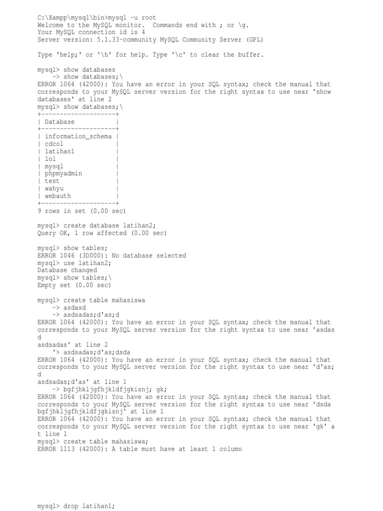 Your MySQL connection id is 4 Server version: 5.1.33-community MySQL Community Server (GPL) Type 'help;' or '\h' for help. Type '\c' to clear the buffer. mysql> show databases -> show databases;\ ERROR 1064 (42000): You have an error in your SQL syntax; check the manual that corresponds to your MySQL server version for the right syntax to use near 'show databases' at line 2 mysql> show databases;\ +--------------------+ | Database | +--------------------+ | information_schema | | cdcol | | latihan1 | | lol | | mysql | | phpmyadmin | | test | | wahyu | | webauth | +--------------------+ 9 rows in set (0.00 sec) mysql> create database latihan2; Query OK, 1 row affected (0.00 sec) mysql> show tables; ERROR 1046 (3D000): No database selected mysql> use latihan2; Database changed mysql> show tables;\ Empty set (0.00 sec) mysql> create table mahasiswa -> asdasd -> asdsadas;d'as;d ERROR 1064 (42000): You have an error in corresponds to your MySQL server version d asdsadas' at line 2 '> asdsadas;d'as;dsda ERROR 1064 (42000): You have an error in corresponds to your MySQL server version d asdsadas;d'as' at line 1 -> bgfjhkljgfhjkldfjgkisnj; gk; ERROR 1064 (42000): You have an error in corresponds to your MySQL server version bgfjhkljgfhjkldfjgkisnj' at line 1 ERROR 1064 (42000): You have an error in corresponds to your MySQL server version t line 1 mysql> create table mahasiswa; ERROR 1113 (42000): A table must have at