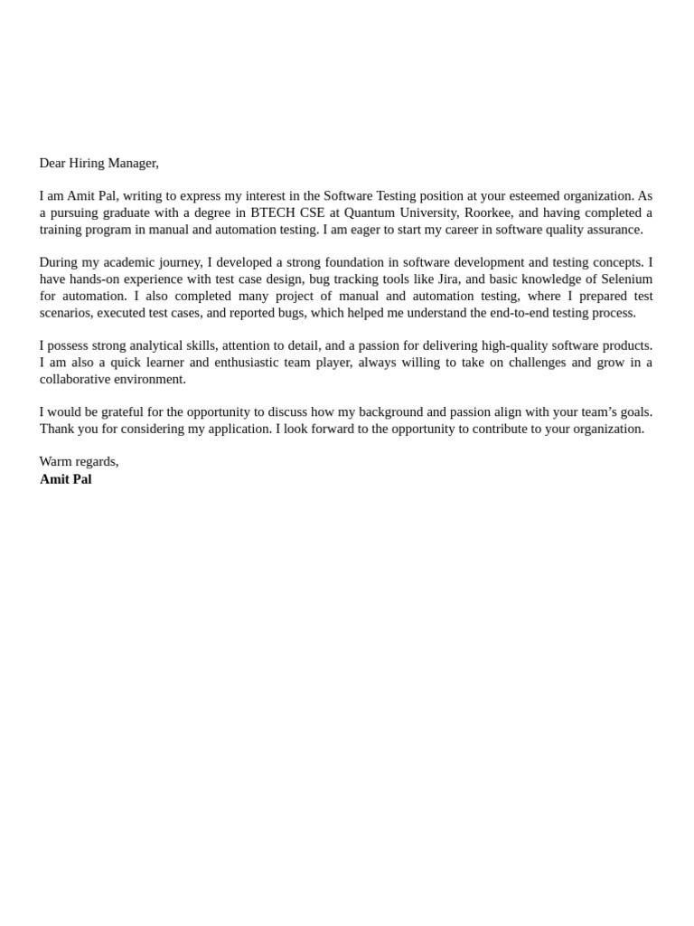 I am Amit Pal, writing to express my interest in the Software Testing position at your esteemed organization. As