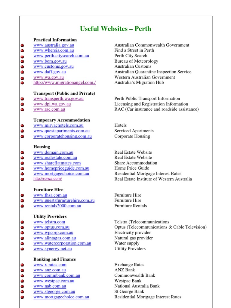 Education www.eddept.wa.edu.au www.ais.wa.edu.au www.ceowa.perth.catholic.edu.au www.tafe.wa.gov.au www.uwa.edu.au www.curtin.edu.au www.ecu.edu.au www.murdoch.edu.au Health www.medicareaustralia.gov.au www.health.wa.gov.au www.ambulance.net.au Employment www.workplace.gov.au www.seek.com.au www.careerone.com.au Sports / Fitness www.ausport.gov.au www.fernwood.net.au Leisure www.countrywide.com.au www.perthfestival.com.au www.about-australia.com/wa.htm Shopping www.westfield.com.au Dining www.bestrestaurants.com.au Nanny and Housekeeping Services www.dial-an-angel.com.au Other www.whitepages.com.au www.yellowpages.com.au Pets http://perth.topdogminders.com www.rspca.org.au