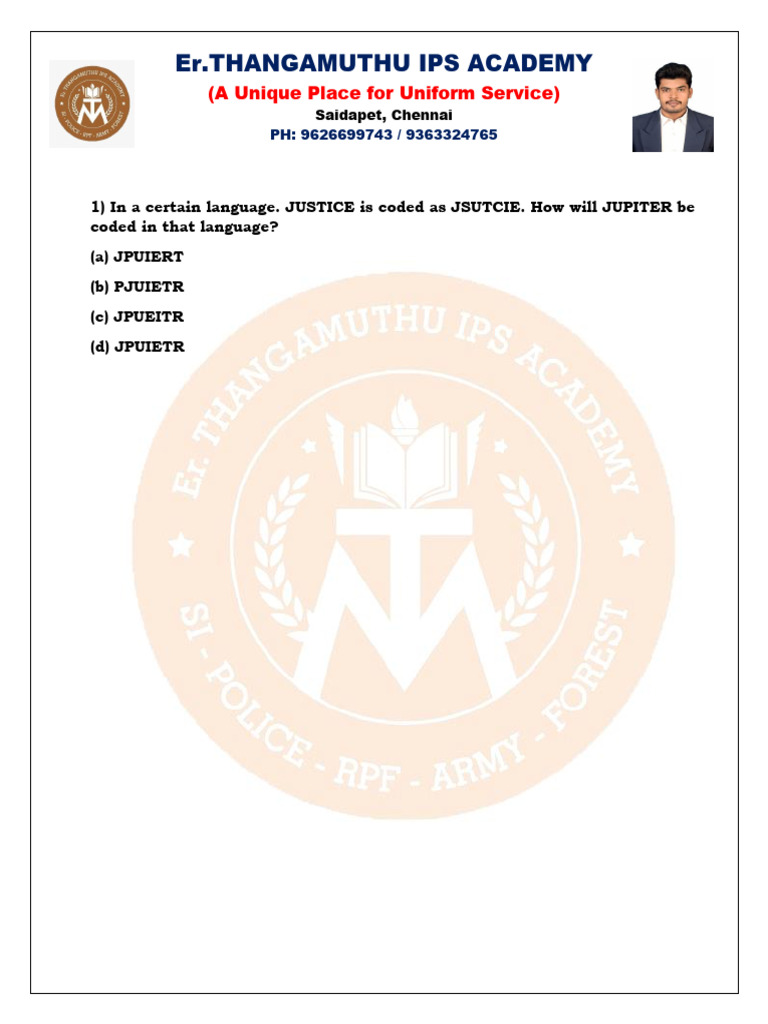 1) In a certain language. JUSTICE is coded as JSUTCIE. How will JUPITER be