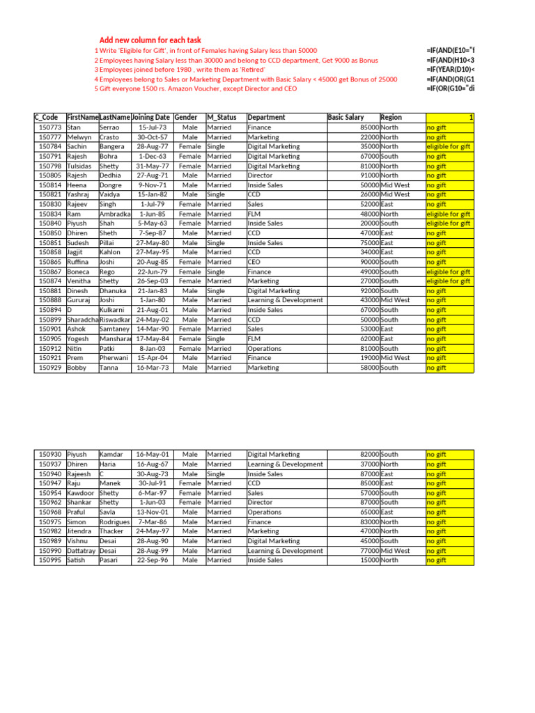 1 Write 'Eligible for Gift', in front of Females having Salary less than 50000 =IF(AND(E10="female",H10<50000)