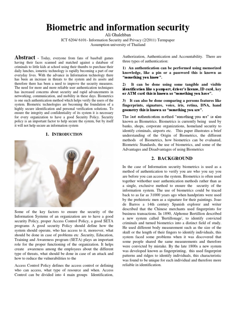 - Today, everyone from fans of baseball games having their faces scanned and matched against a database of criminals to little kids at school using their thumbs to purchase their daily lunches, iometric technology is rapidly becoming a part of our everyday lives. With the advance in Information technology there has been an increase in threats to the system and its assets and therefore there has been a need to improve the security measures. The need for more and more reliable user authentication techniques has increased concerns about security and rapid advancements in networking, communication, and mobility in these days. Biometrics is one such authentication method which helps verify the users of the system. Biometric technologies are becoming the foundation of a highly secure identification and personal verification solutions. To ensure the integrity and confidentiality of its system it is necessary for every organization to have a good Security Policy. Security policy is an important factor to help secure the system, but by itself it will not help secure an information system