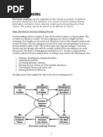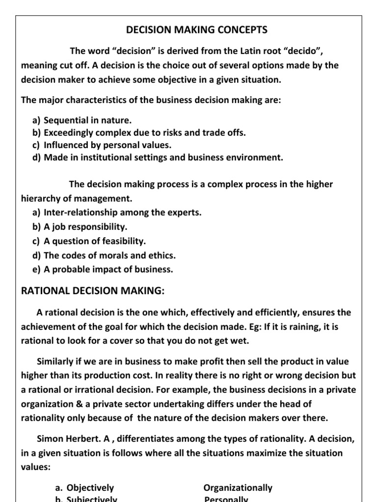The word decision is derived from the Latin root decido, meaning cut off. A decision is the choice out of several options made by the decision maker to achieve some objective in a given situation. The major characteristics of the business decision making are: a) Sequential in nature. b) Exceedingly complex due to risks and trade offs. c) Influenced by personal values. d) Made in institutional settings and business environment. The decision making process is a complex process in the higher hierarchy of management. a) Inter-relationship among the experts. b) A job responsibility. c) A question of feasibility. d) The codes of morals and ethics. e) A probable impact of business.