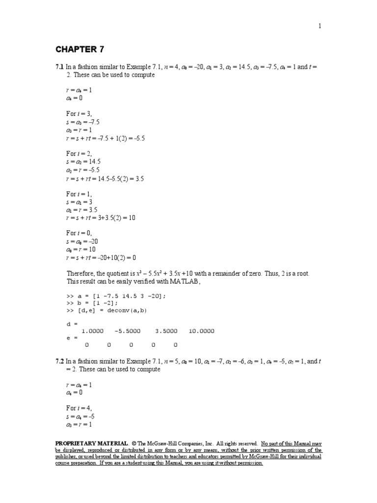7.1 In a fashion similar to Example 7.1, n = 4, a0 = a1 = 3, a2 = 14.5, a3 = 20, 7.5, a4 = 1 and t = 2. These can be used to compute r = a4 = 1 a4 = 0 For i = 3, s = a3 = 7.5 a3 = r = 1 r = s + rt = + 1(2) = 7.5 5.5 For i = 2, s = a2 = 14.5 a2 = r = 5.5 r = s + rt = 14.5 5.5(2) = 3.5 For i = 1, s = a1 = 3 a1 = r = 3.5 r = s + rt = 3+3.5(2) = 10 For i = 0, s = a0 = 20 a0 = r = 10 r = s + rt = 20+10(2) = 0 Therefore, the quotient is x3 5.5x2 + 3.5x +10 with a remainder of zero. Thus, 2 is a root. This result can be easily verified with MATLAB,