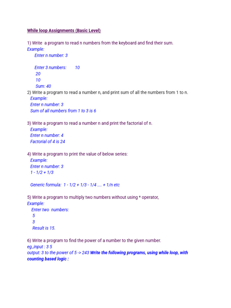 output: 3 to the power of 5 -> 243 Write the following programs, using while loop, with
