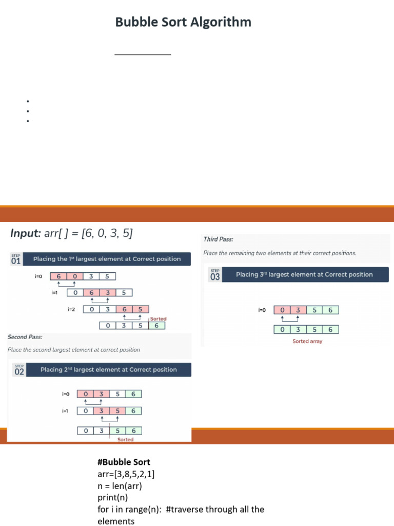 •traverse from left and compare adjacent elements and the higher one is placed at right side.