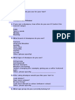 1. What brands in the in-salon professional hair color category are you aware of? a. Schwarzkopf b. LOreal c. Matrix d. Wella 2. How often do you color your hair? a. Once a year b. Twice a year c. More than twice a year 3. Which brands have you used so far? a. Schwarzkopf b. LOreal c. Matrix d. Wella 4. How do you decide on a hair color brand? a. Ask hair dressers opinion b. Consult friends c. Read reviews online and in magazines d. In-salon visuals 5. What would prompt you to try new hair color brand? a. Free samples b. In-Salon visuals