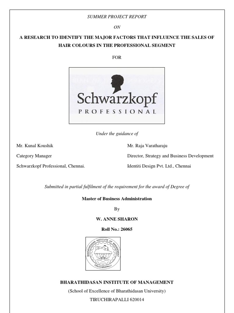 I sincerely thank Mr. Raja Varatharaju, Director-Strategy and Business development, Identity Design Pvt Ltd., for his continuous guidance and moral support throughout the phase of my project. My thanks to Mr. Murali Sundar, General Manager (India), Schwarzkopf Professional for his valuable inputs and feedback for the project. I am very grateful to Mr. Kunal Koushik, Category Manager, Schwarzkopf Professional, for having guided me through every small step in my project. I thank him for having been very supportive of my work and also for providing valuable suggestions which helped to take my project to successful completion.