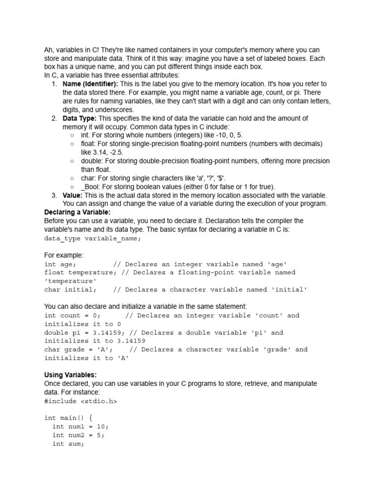 variable's name and its data type. The basic syntax for declaring a variable in C is: