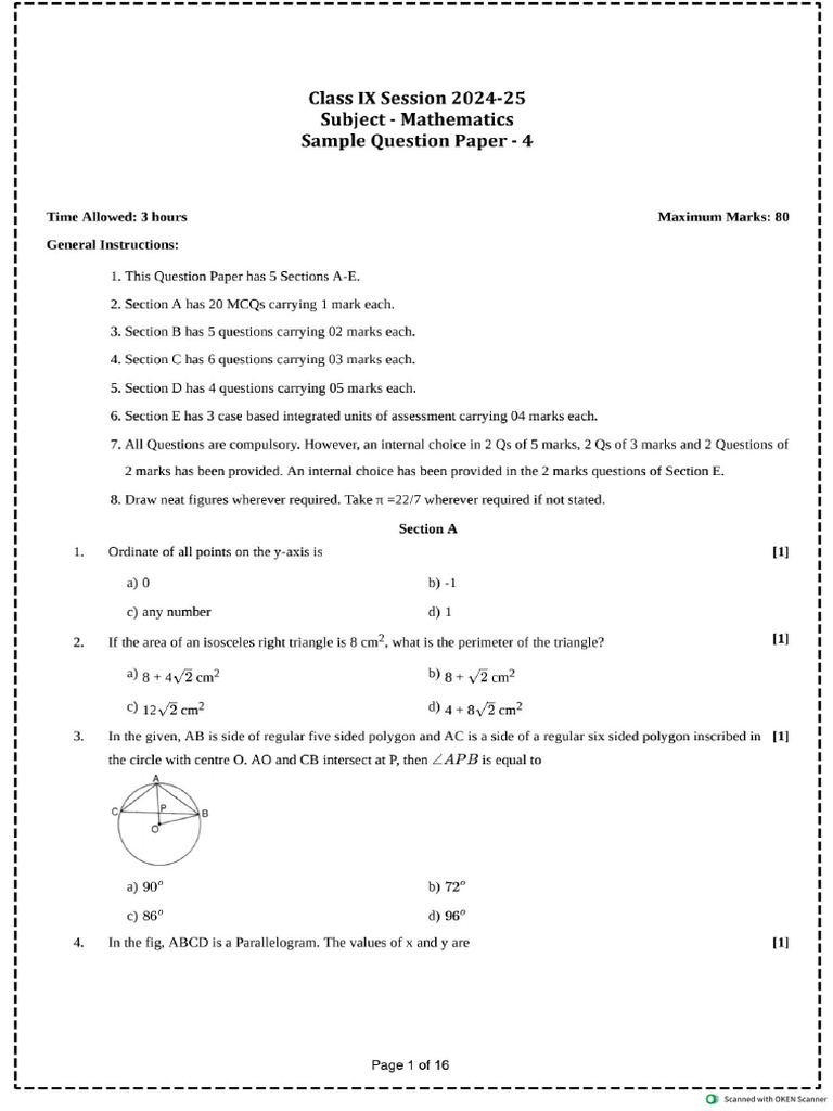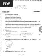 This document is a sample question paper for Class IX Mathematics for the session 2024-25, comprising five sections (A-E) with a total of 80 marks. It includes multiple-choice questions, short answer questions, and case-based integrated units of assessment, with internal choices provided in certain questions. The paper covers various mathematical concepts and requires students to demonstrate their understanding through problem-solving and proofs.