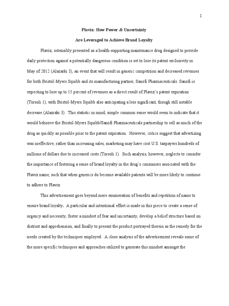 Plavix: How Power & Uncertainty Are Leveraged to Achieve Brand Loyalty Plavix, ostensibly presented as a health-supporting maintenance drug designed to provide daily protection against a potentially dangerous condition is set to lose its patent exclusivity in May of 2012 (Alazarki 3), an event that will result in generic competition and decreased revenues for both Bristol-Myers Squibb and its manufacturing partner, Sanofi Pharmaceuticals. Sanofi is expecting to lose up to 15 percent of revenues as a direct result of Plavixs patent expiration (Torsoli 1), with Bristol-Myers Squibb also anticipating a less significant, though still notable decrease (Alazraki 3). This statistic in mind, simple common sense would seem to indicate that it would behoove the Bristol-Myers Squibb/Sanofi Pharmaceuticals partnership to sell as much of the drug as quickly as possible prior to the patent expiration. However, critics suggest that advertizing was ineffective; rather than increasing sales, marketing may have cost U.S. taxpayers hundreds of millions of dollars due to increased costs (Torsoli 1). Such analysis, however, neglects to consider the importance of fostering a sense of brand loyalty in the drugs consumers associated with the Plavix name, such that when generics do become available patients will be more likely to continue to adhere to Plavix. This advertisement goes beyond mere enumeration of benefits and repetition of name to ensure brand loyalty. A particular and intentional effort is made in this piece to create a sense of urgency and necessity, foster a mindset of fear and uncertainty, develop a belief structure based on distrust and apprehension, and finally to present the product portrayed therein as the remedy for the needs created by the techniques employed. A close analysis of the advertisement reveals some of the more specific techniques and approaches utilized to generate this mindset amongst the