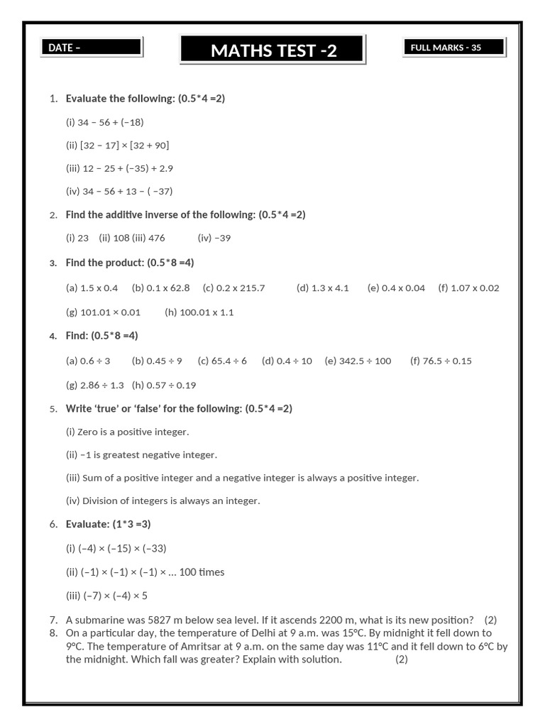 DATE – MATHS TEST -2 FULL MARKS - 35