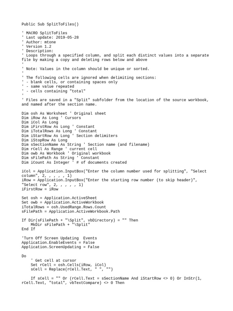' Files are saved in a "Split" subfolder from the location of the source workbook,
