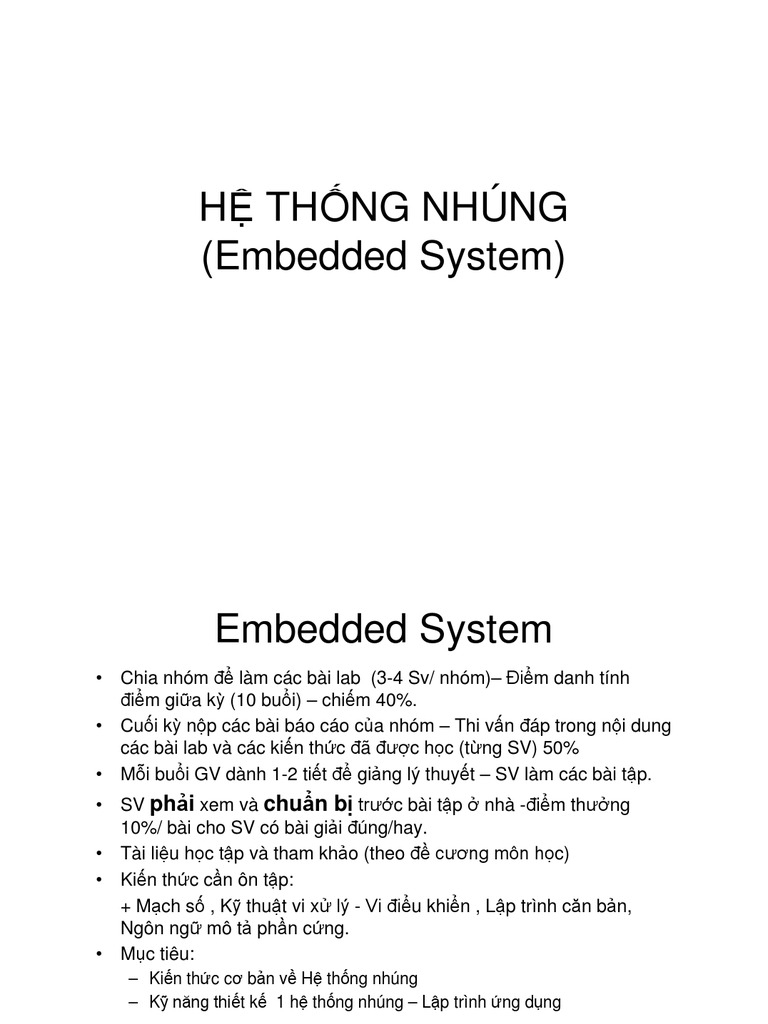 Chia nhm lm cc bi lab (3-4 Sv/ nhm) i m danh tnh i m gi a k (10 bu i) chi m 40%. Cu i k n p cc bi bo co c a nhm Thi v n p trong n i dung cc bi lab v cc ki n th c c h c (t ng SV) 50% M i bu i GV dnh 1-2 ti t gi ng l thuy t SV lm cc bi t p. SV ph i xem v chu n b tr c bi t p nh -i m th ng 10%/ bi cho SV c bi gi i ng/hay. Ti li u h c t p v tham kh o (theo cng mn h c) Ki n th c c n n t p: + M ch s , K thu t vi x l - Vi i u khi n , L p trnh cn b n, Ngn ng m t ph n c ng. M c tiu: