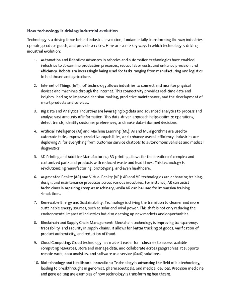In summary, technology is a catalyst for industrial evolution by enhancing productivity, sustainability,