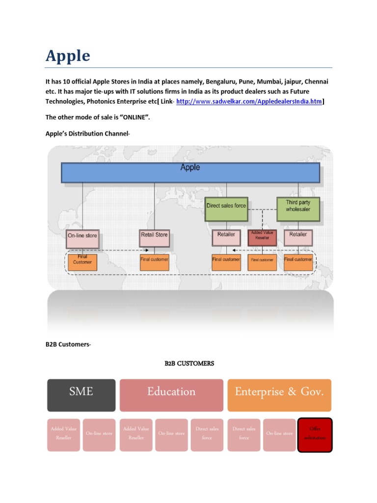 It has 10 official Apple Stores in India at places namely, Bengaluru, Pune, Mumbai, jaipur, Chennai etc. It has major tie-ups with IT solutions firms in India as its product dealers such as Future Technologies, Photonics Enterprise etc[ Link- http://www.sadwelkar.com/AppledealersIndia.htm] The other mode of sale is ONLINE. Apples Distribution Channel-