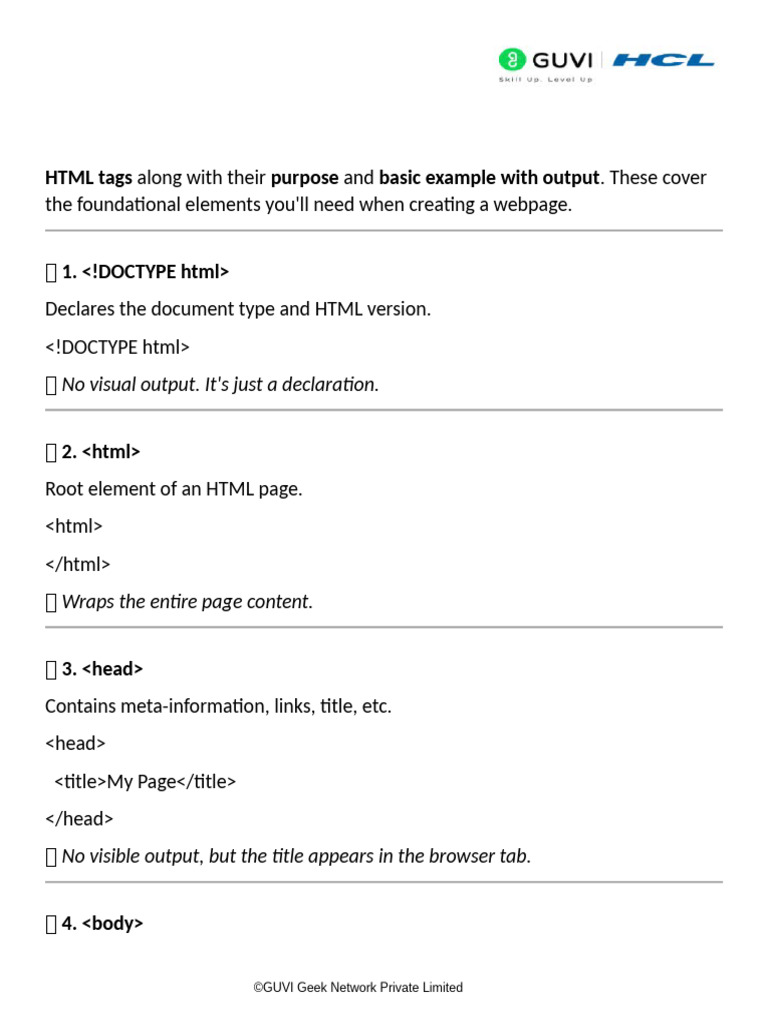 HTML tags along with their purpose and basic example with output.
