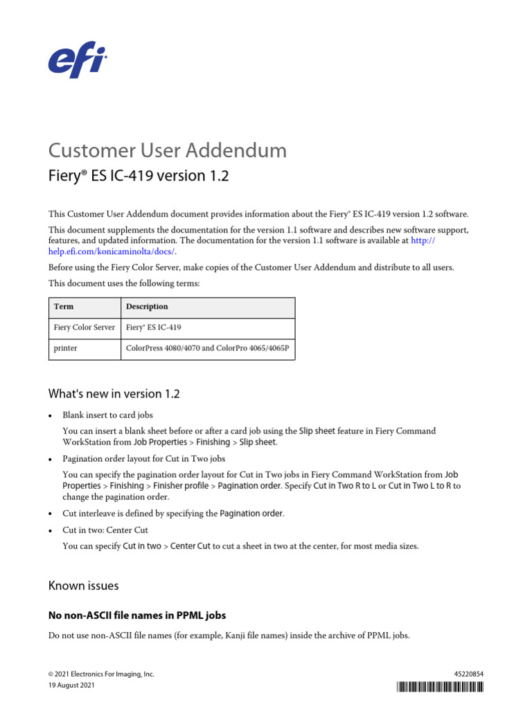 This Customer User Addendum document provides information about the Fiery® ES IC-419 version 1.2 software.