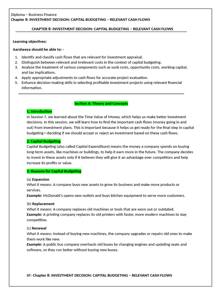 BF: Chapter 8: INVESTMENT DECISION: CAPITAL BUDGETING – RELEVANT CASH FLOWS