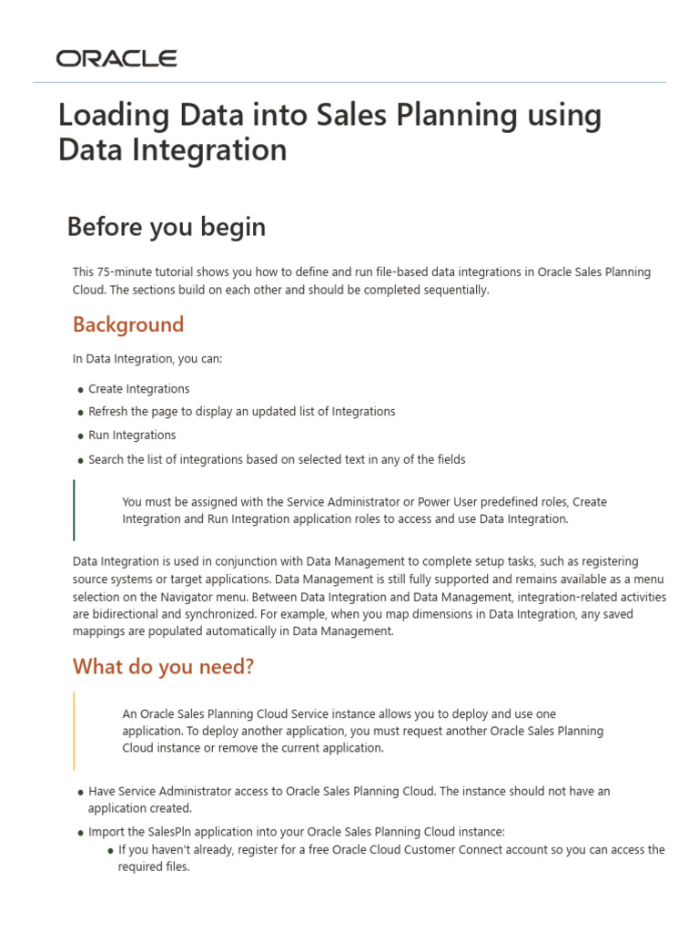 This 75-minute tutorial shows you how to define and run file-based data integrations in Oracle Sales Planning
