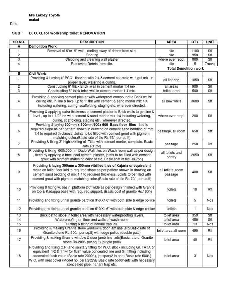 DESCRIPTION Demolition Work Removal of 6"or 9" wall , carting away of debris from site. Flooring Chipping and cleaning wall plaster Removing Debris from site. Civil Work Providing & Laying 4" PCC flooring with 2:4:8 cement concrete with grit mix. in proper level, watering & curing. Constructing 6" thick Brick wall in cement mortar 1:4 mix. Constructing 6" thick brick wall in cement mortar 1:4 mix. Providing & applying cement plaster with waterproof compound to Brick walls/ ceiling etc. in line & level up to 1" thk with cement & sand mortar mix 1:4 including watering, curing, scaffolding, staging etc. wherever directed. AREA QTY UNIT