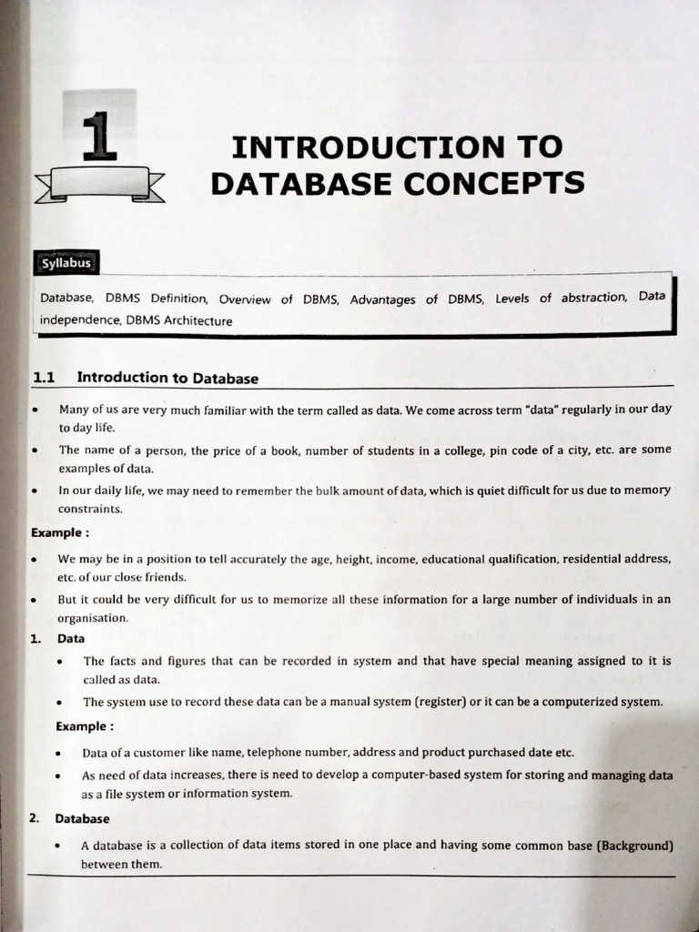 Database, DBMS Definition, Overview of DBMS, Advantages of DBMS, Levels of abstraction, Data