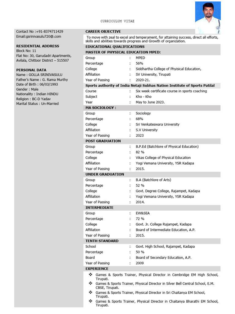 Games & Sports Trainer, Physical Director in Sri Seshachala EM School, Tirupati.