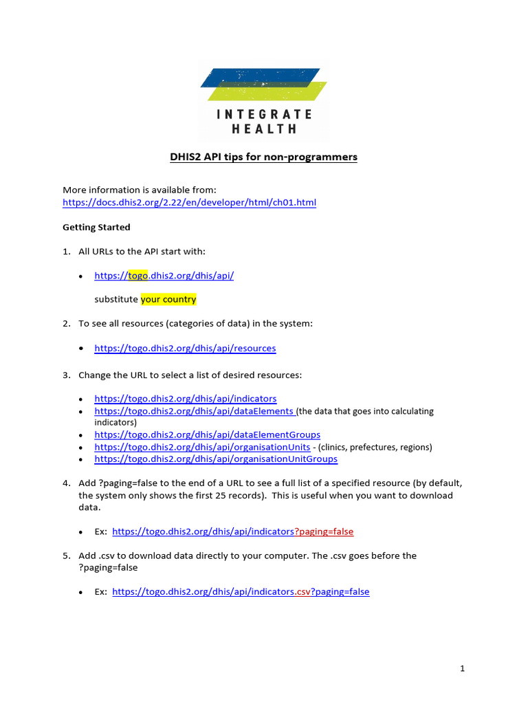 • Ex: https://togo.dhis2.org/dhis/api/indicators?paging=false