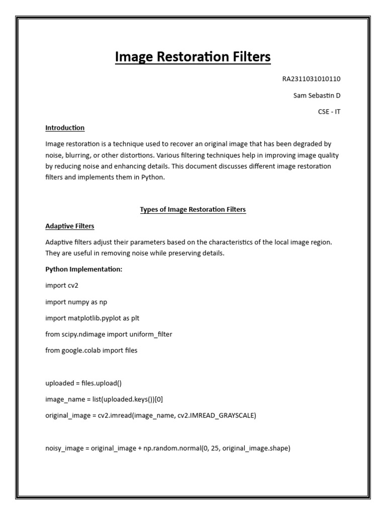 Each filter has its advantages based on the type of noise and degradation present in the image.