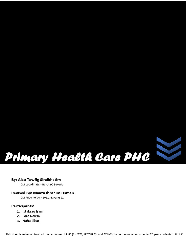 This sheet is collected from all the resources of PHC (SHEETS, LECTURES, and EXAMS) to be the main resource for 5th year students in U of K.