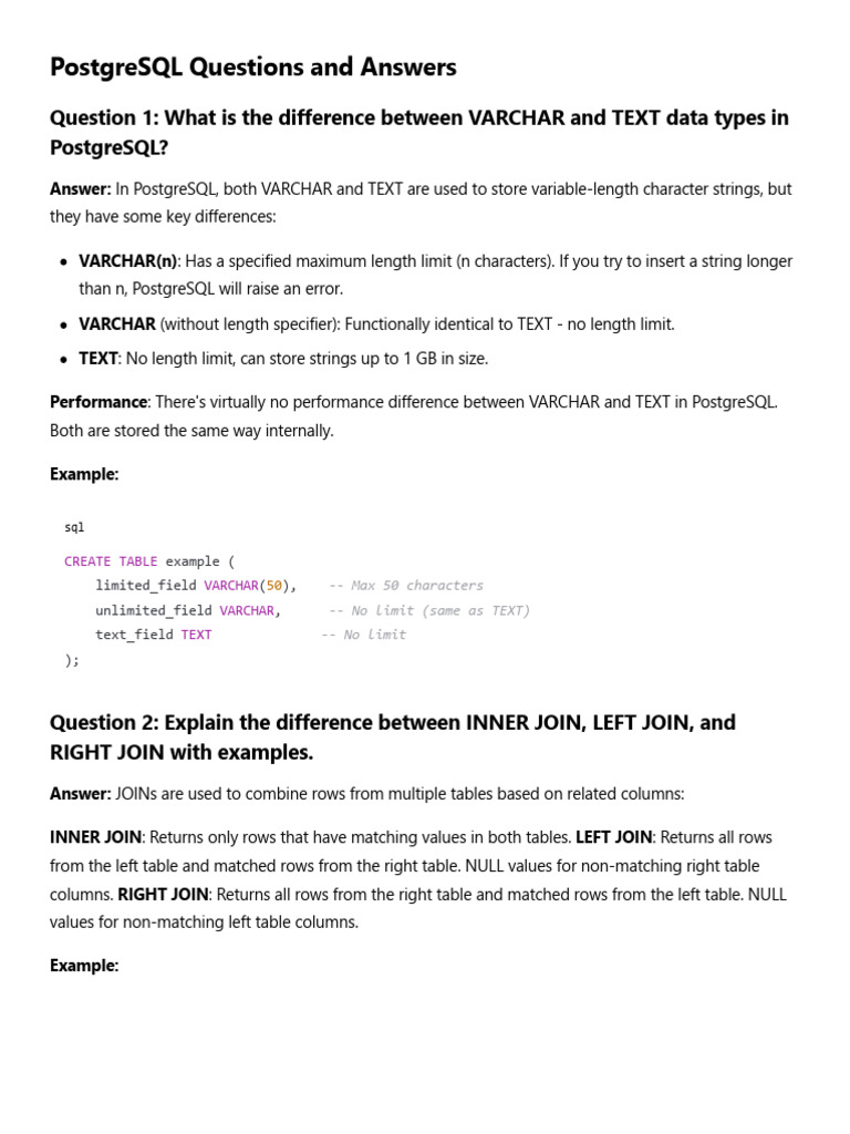 Question 1: What is the difference between VARCHAR and TEXT data types in