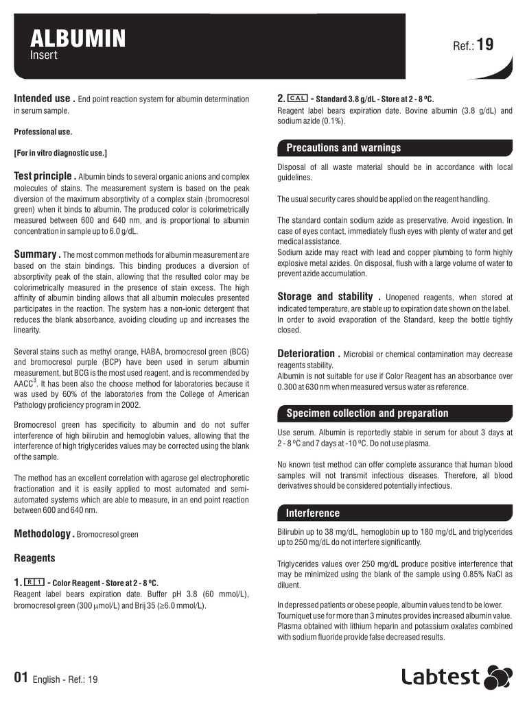 reagent stability and to obtain correct results. Albumin 19-1/250