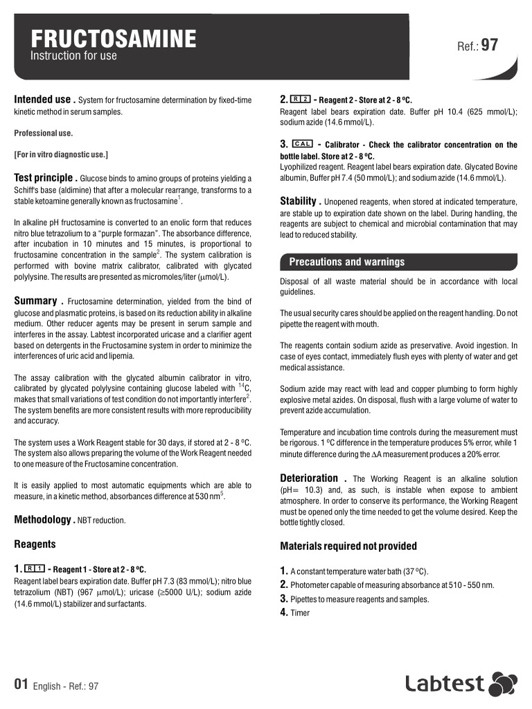 stable ketoamine generally known as fructosamine1. Stability . Unopened reagents, when stored at indicated temperature,