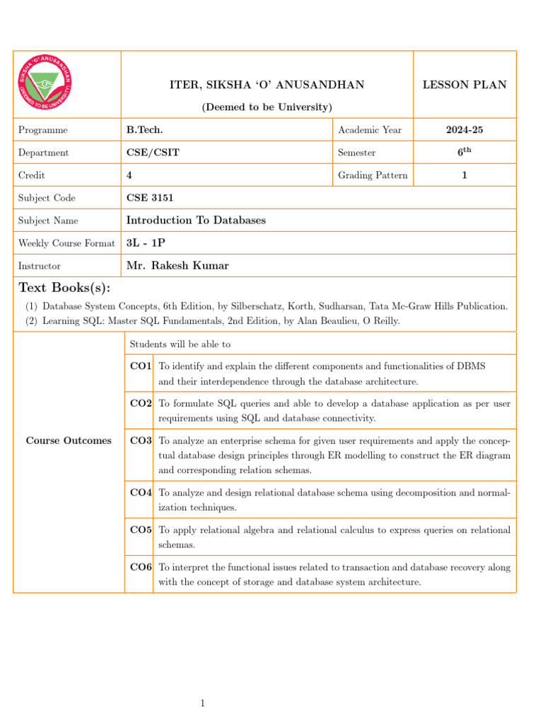 Course Outcomes CO3 To analyze an enterprise schema for given user requirements and apply the concep-