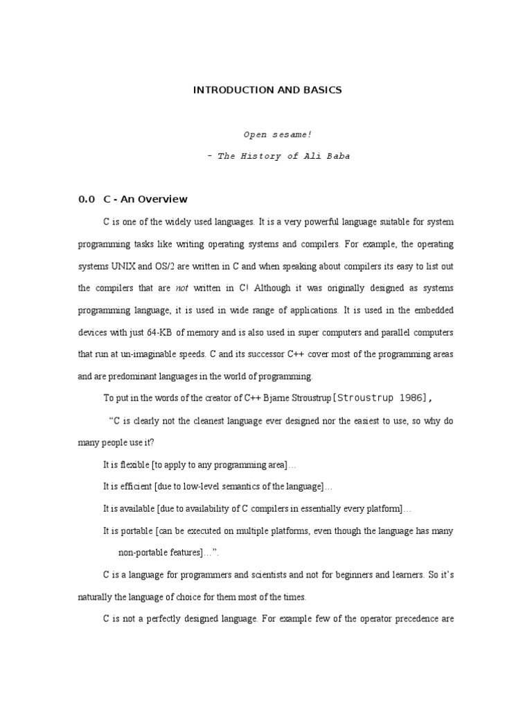 0.0 C - An Overview C is one of the widely used languages. It is a very powerful language suitable for system programming tasks like writing operating systems and compilers. For example, the operating systems UNIX and OS/2 are written in C and when speaking about compilers its easy to list out the compilers that are not written in C! Although it was originally designed as systems programming language, it is used in wide range of applications. It is used in the embedded devices with just 64-KB of memory and is also used in super computers and parallel computers that run at un-imaginable speeds. C and its successor C++ cover most of the programming areas and are predominant languages in the world of programming. To put in the words of the creator of C++ Bjarne Stroustrup[Stroustrup 1986], C is clearly not the cleanest language ever designed nor the easiest to use, so why do many people use it? It is flexible [to apply to any programming area] It is efficient [due to low-level semantics of the language] It is available [due to availability of C compilers in essentially every platform] It is portable [can be executed on multiple platforms, even though the language has many non-portable features]. C is a language for programmers and scientists and not for beginners and learners. So its naturally the language of choice for them most of the times. C is not a perfectly designed language. For example few of the operator precedence are